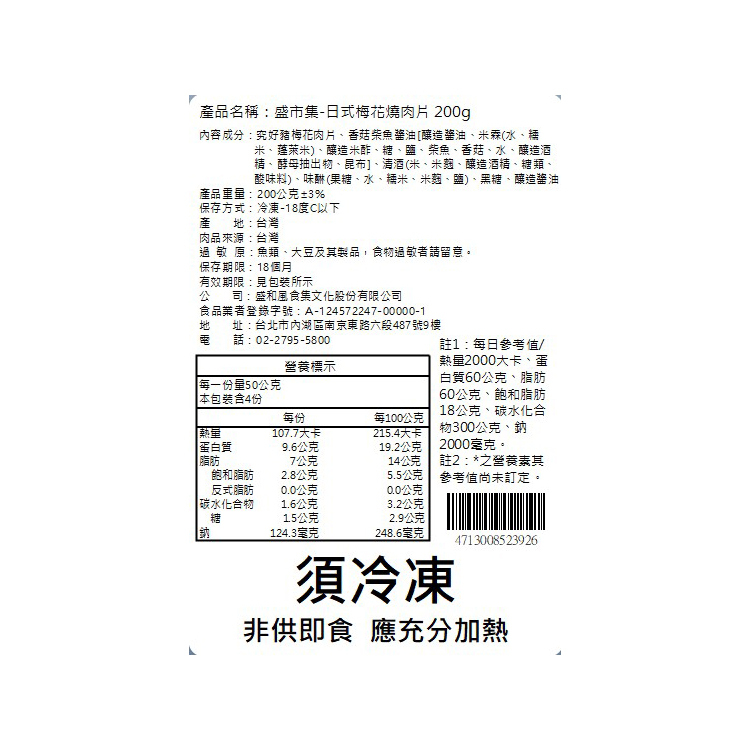 ■ 成分:究好豬梅花肉片、香菇柴魚醬油[釀造醬油、米霖(水、糯米、蓬萊米)、釀造米酢、糖、鹽、柴魚、香菇、水、釀造酒精、酵母抽出物、昆布]、清酒(米、米麴、釀造酒精、糖類、酸味料)、味醂(果糖、水、糯米、米麴、鹽)、黑糖、釀造醬油