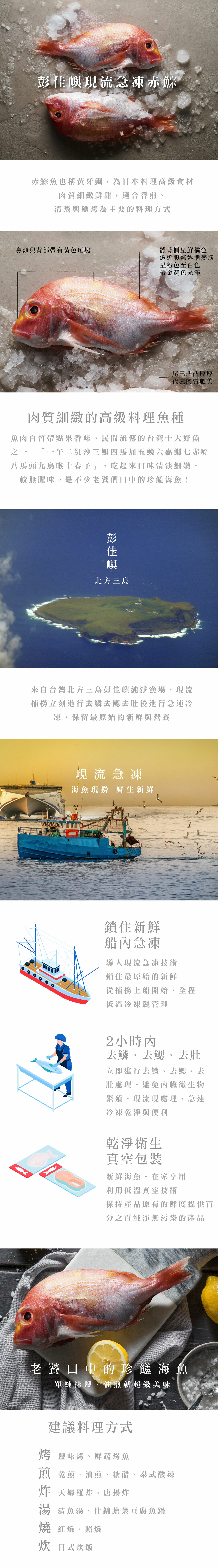 ● 赤鯮魚也稱黃牙鯛,來自北方三島彭佳嶼純淨漁場,現流捕撈立刻進行去鱗去鰓去肚後進行急速冷凍,保留最原始的新鮮與營養